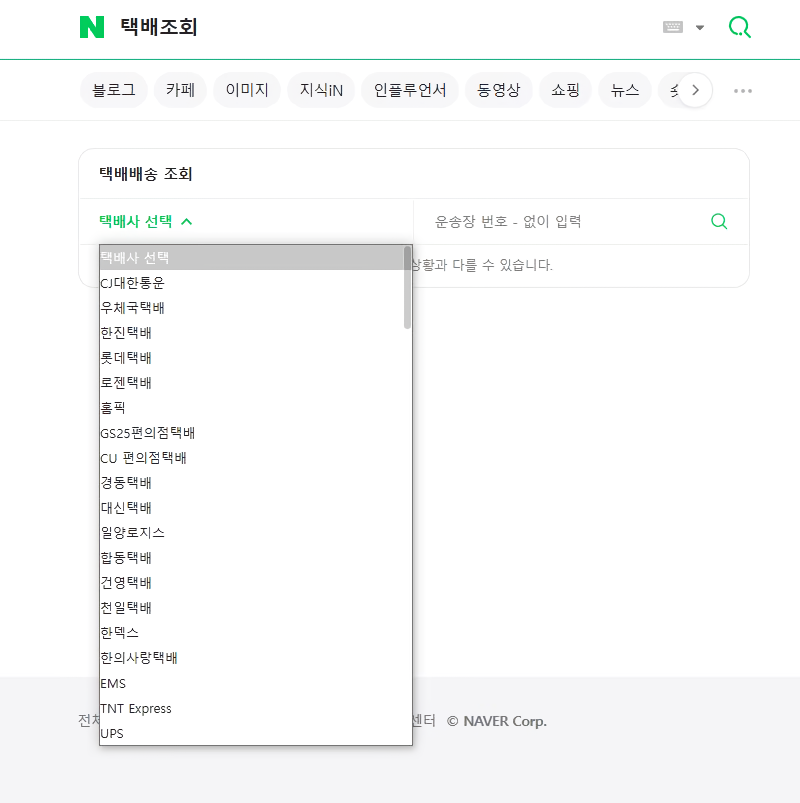 - 메인화면에서 택배조회라고 입력하고 검색을 누릅니다.